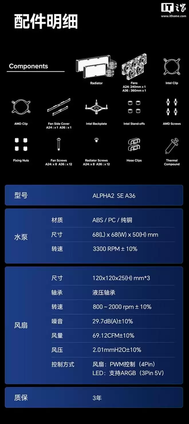 IT之家 12 月 14 日消息,zalman 思民 ALPHA2 SE A36 一体式水冷散热器现已开售,提供黑白两种配色,相比 A36 和 DS A36 主要是将冷头的数显 LCD 屏改为纯 RGB 灯带装饰,到手价 339 元起。