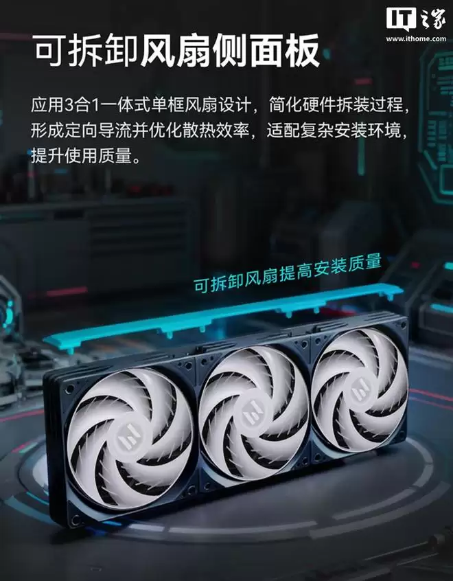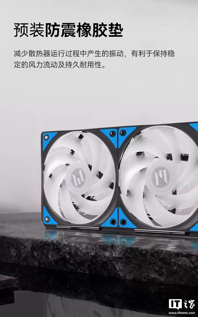 设计方面,这款水冷的风扇采用鲨鱼鳍刀片,有利于简化风扇叶片气流,减少乱流,防止形成涡流并降低噪音,风扇侧面板采用 3 合 1 一体式单框设计,简化硬件拆装过程,预装防震橡胶垫,有利于减少震动降低噪音。