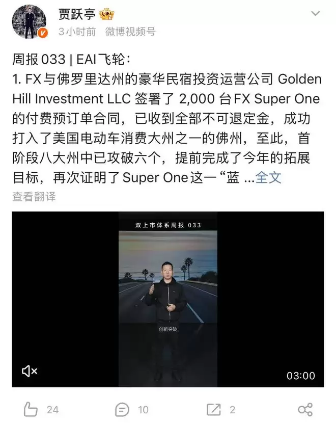 12月15日,法拉第未来(FF)创始人、联席CEO贾跃亭在微博发文透露,其FF超级旗舰车型 FX Super One 与佛罗里达州的豪华民宿投资运营公司 Golden Hill Investment LLC 正式签署了2000台的付费预订合同,并已收到全部不可退定金。此举意味着FF成功打入了美国电动车消费大州之一的佛罗里达州。至此,其首阶段规划的八大美国重点市场中,已成功攻克六个,提前完成了今年的市场拓展目标。