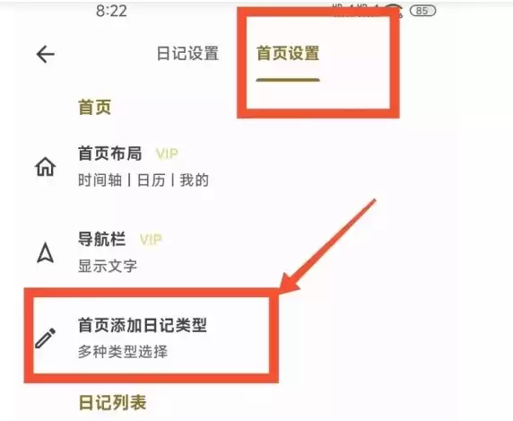 进入新页面后,找到并点击箭头指示的【首页添加日记类型】功能。
