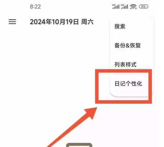 接着,在弹出的菜单中,点击箭头所指的【日记个性化】选项。
