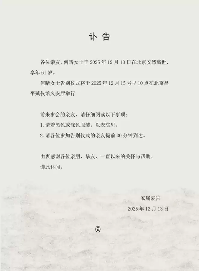 据扬子晚报等多家媒体报道,落款时间为昨日(12月13日)的一份家属发布讣告显示,著名演员何晴在北京安然离世,享年61岁。告别仪式将于12月15日早10点在北京昌平殡仪馆久安厅举行。