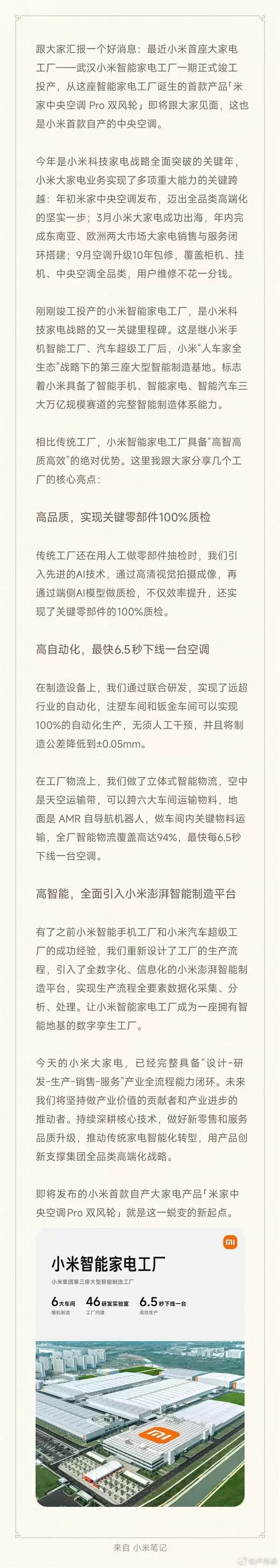 这标志着小米已构建起在智能手机、智能家电、智能汽车三大万亿级赛道所需的完整智能制造体系能力。