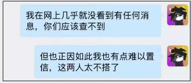 业内人称是今年6月份听说这个传闻,第一时间觉得是八竿子打不着的人,身边也没多少人了解,了解后发现两个人很般配,男生不是爱玩的那一类型,属于顶峰相见,并罗列了三个关键信息点。