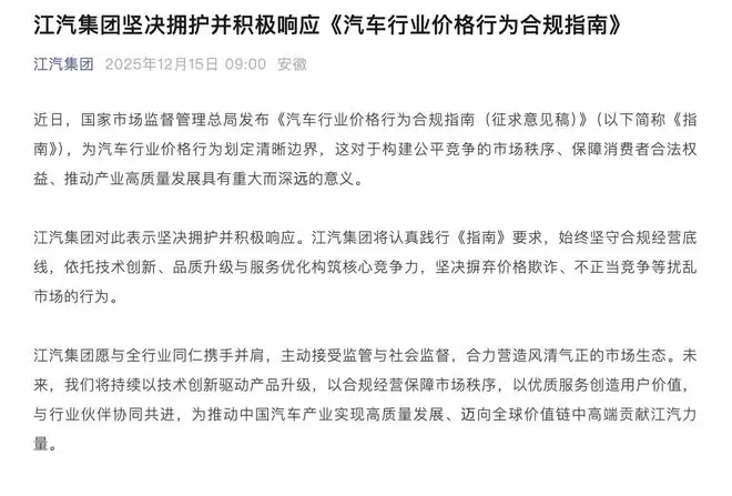 IT之家12月15日消息。近期,国家市场监督管理总局发布《汽车行业价格行为合规指南(征求意见稿)》。今天上午,江汽集团通过官方公众号发表声明,表示坚决拥护并积极响应。江汽集团称,将认真践行《指南》要求,始终坚守合规经营底线,依托技术创新、品质升级与服务优化构建核心竞争力,坚决摒弃价格欺诈、不正当竞争等扰乱市场的行为。