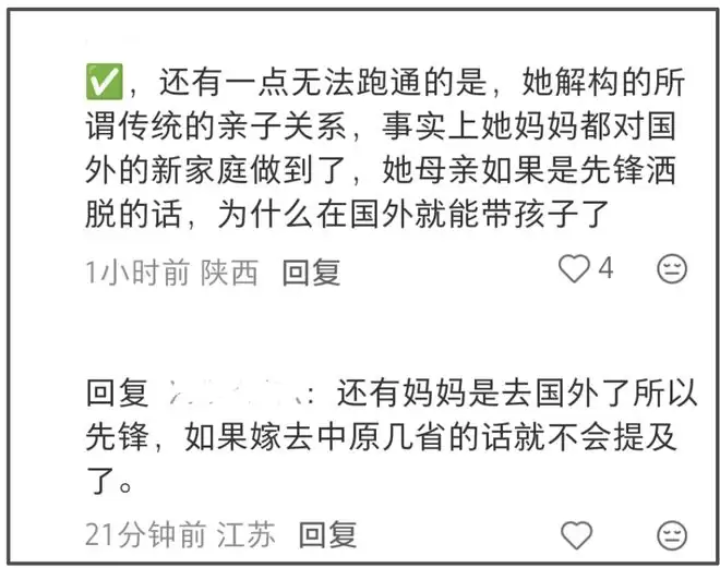把王悦伊过往言论和她近期一系列视频结合起来看,网友分析一针见血,不管王悦伊如何诡辩,她对母亲的崇拜和赞扬,都是建立在对方出国嫁了个洋人的基础上。