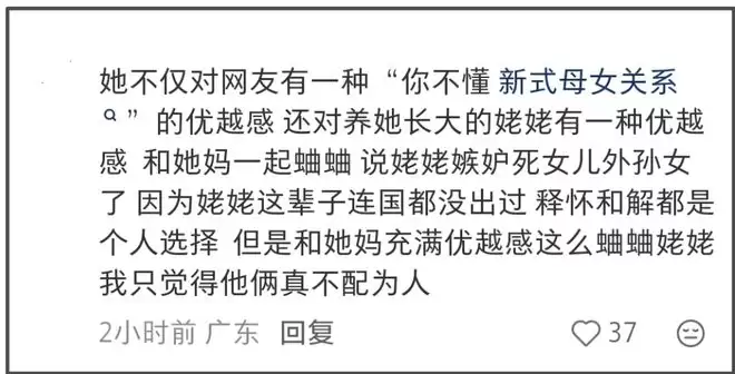 更微妙的是,王悦伊曾经强调自己的姥姥嫉妒妈妈,就因为妈妈离婚出国了,而姥姥只能留在中国把她养育长大……