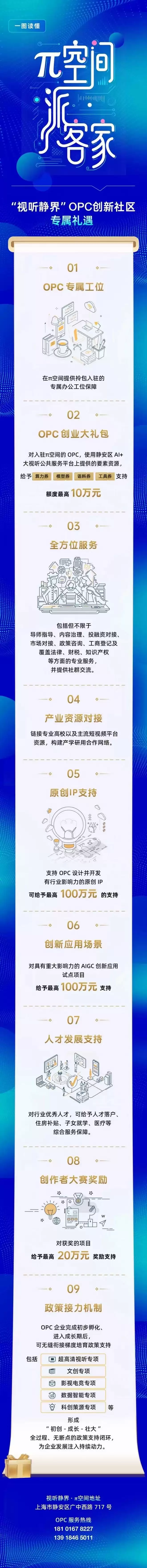 有载体更要有政策。近日,上海市静安区正式发布“视听静界”OPC创新社群专属礼遇,涵盖九大方面。