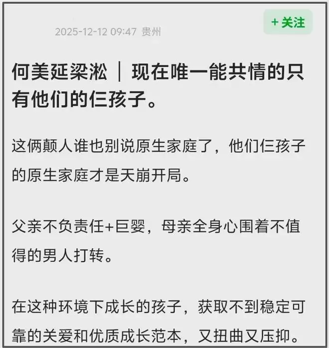 正如网友所说,需要同情的不光是何美延的婆婆,还有何美延和梁淞的三个孩子,他们正在经历真正的原生家庭之殇呢。