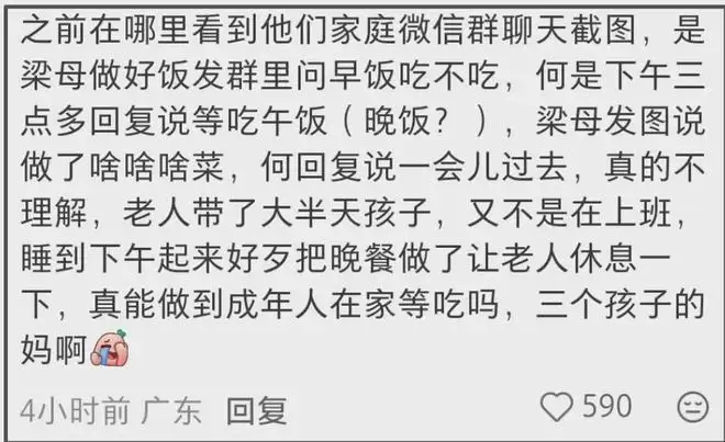 如果放到普通家庭上,可能还存在双职工育儿困境,但就何美延一睡一整天的情况看,至少可以做到儿媳和婆婆共同承担育儿责任吧?