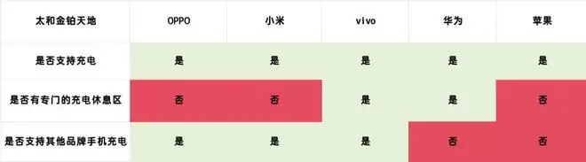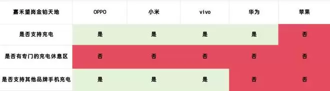 其中小米和华为是明确暂时没有充电服务,或许这与他们当时店内人流量较大有关系,而vivo和OPPO虽然支持,但同样没有设立专门的充电站,不过OPPO依旧支持共享充电宝服务,这一点上还是要略微胜于其他几家的。