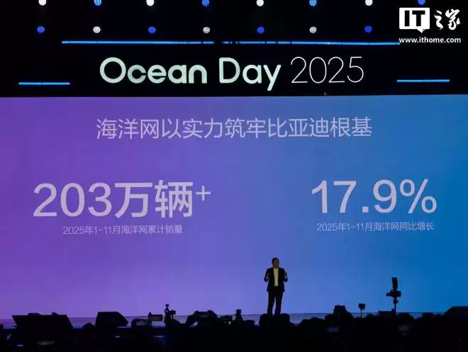 IT之家从发布会现场获悉,比亚迪今年前11个月累计销量已达418万辆,同比增长11.3%。其中,海洋网今年前11个月累计销量突破203万辆,同比增长幅度达到17.9%。