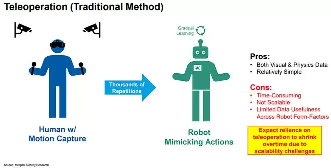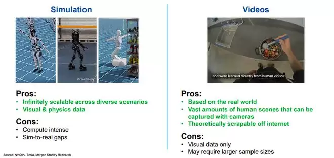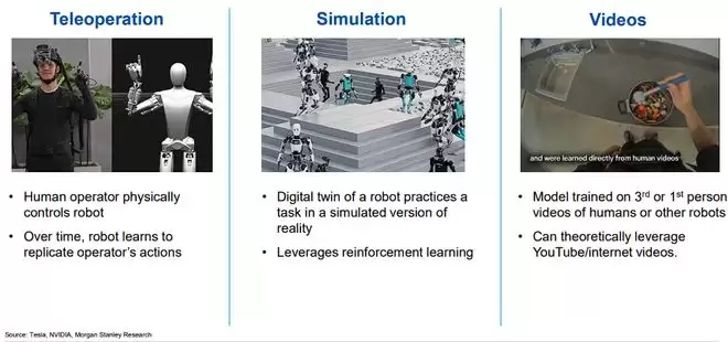 该行指出,特斯拉、英伟达、谷歌等科技巨头正在通过远程操作、模拟训练和视频学习三种主要方式收集训练数据。