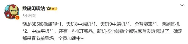 据透露,这次的产品阵容堪称豪华全家桶:搭载第五代骁龙8至尊版的影像旗舰、两款天玑芯片中端机、全智能手表、两副耳机、中端平板以及若干IoT产品。