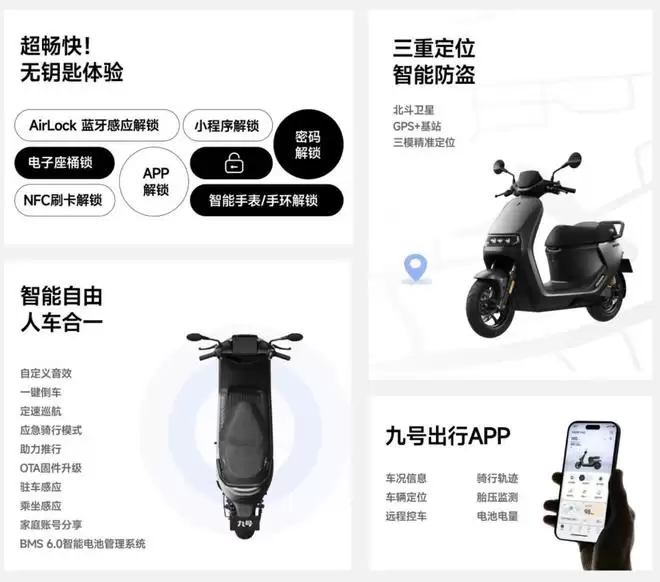 以目前主流的头部品牌为例,无论是雅迪、九号,还是小牛,都在积极强化电动车的智能属性。远程定位、防盗提醒、骑行数据统计、App 生态,已经逐渐成为中高端车型的标配卖点。