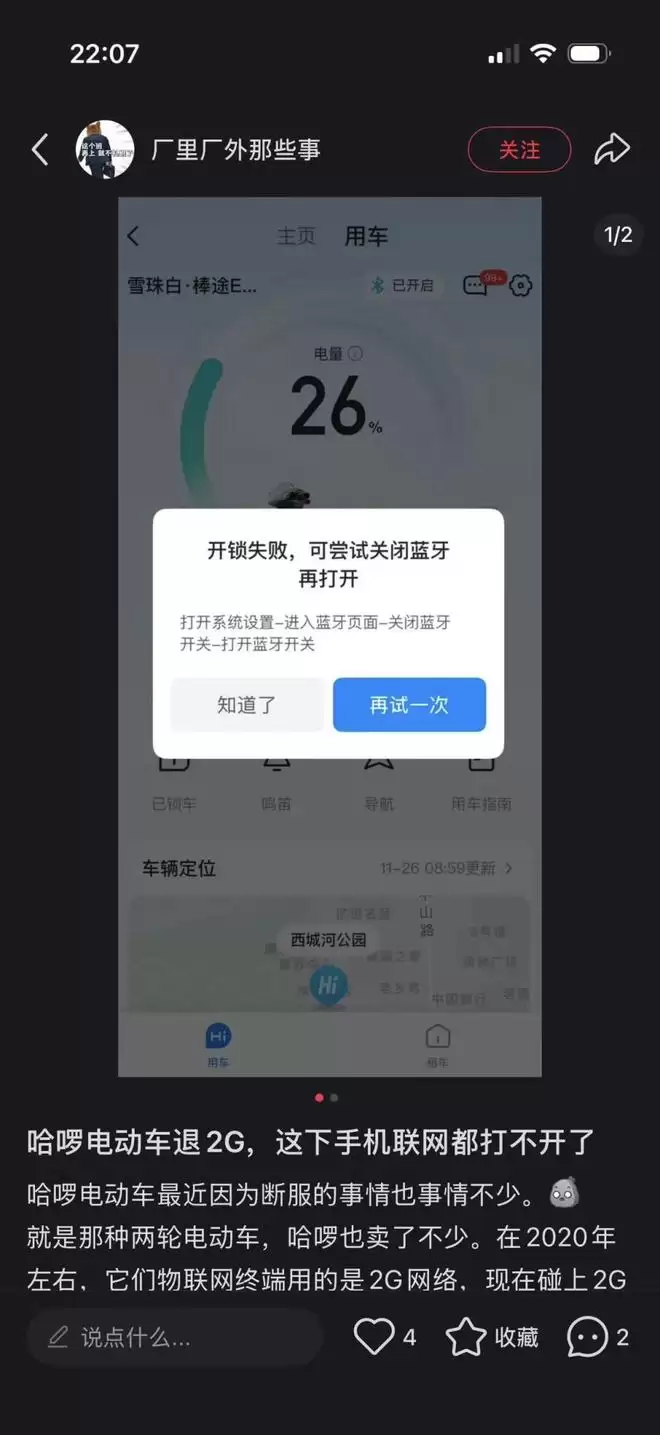 2025 年 12 月,多名用户表示自己的哈啰电动车出现「断网」情况,原本可以通过 App 远程查看电量、定位车辆的功能突然消失,部分用户甚至在社交平台上表达了对安全问题的担忧。哈啰电动车随后也给出回应,称问题源于运营商 2G 网络退网。
