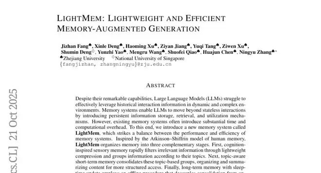 这篇由浙江大学和新加坡国立大学联合研究团队开发的革命性论文发表于2025年,题为《LightMem: Lightweight and Efficient Memory-Augmented Generation》。研究团队由浙江大学的方济涵、邓心乐、徐浩明等多位研究人员,以及新加坡国立大学的邓舒敏教授共同完成,通讯作者是浙江大学的张宁宇教授。这项研究首次提出了一个名为LightMem的创新记忆系统,能让大型语言模型像人类一样拥有高效的记忆机制。