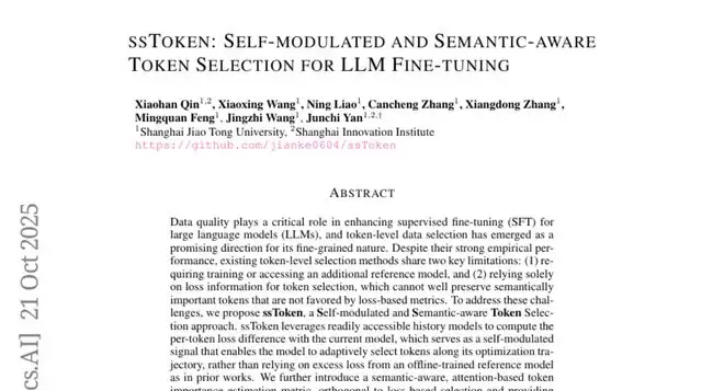 上海交通大学的研究团队提出了一种全新的解决方案,他们称之为ssToken(自调节和语义感知的令牌选择方法)。这个方法的巧妙之处在于,让模型像照镜子一样,通过对比自己的"过去"和"现在"来判断哪些数据最有学习价值。