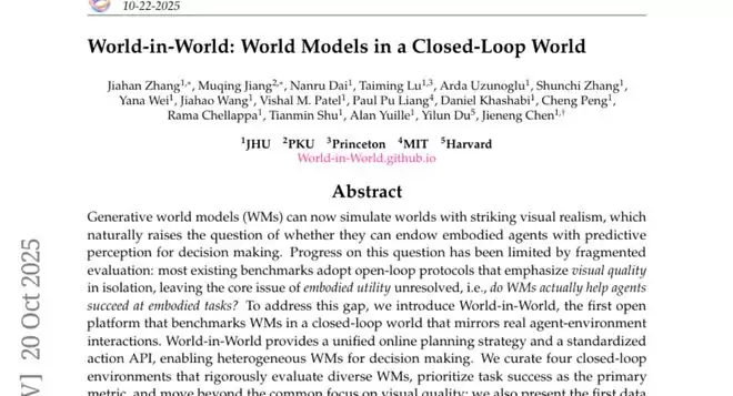 这项由约翰霍普金斯大学张嘉瀚团队牵头,联合北京大学、普林斯顿大学、MIT、哈佛大学等多所知名院校研究人员的突破性研究,于2025年10月发表在计算机视觉领域顶级会议上。有兴趣深入了解的读者可以通过论文编号arXiv:2510.18135查询完整论文。这项研究首次提出了一个完全改变AI世界模型评估方式的开放平台World-in-World,彻底颠覆了传统只看视觉效果的评估标准。 当前的AI世界模型就像电影特效一样,能够生成逼真到令人惊叹的虚拟世界视频。然而问题在于,这些模型虽然看起来很炫酷,但它们在实际应用中的表现如何呢?就好比一个演员虽然长得很帅,但演技是否真的过关,只有让他真正上台表演才能知道。研究团队发现,现有的评估方法就像只看演员的宣传照片就决定是否让他主演电影一样不靠谱——它们只关注生成视频的视觉质量,却忽略了这些AI模型在真实任务中的实际表现能力。 研究团队面临的核心挑战是:如何真正测试这些AI世界模型在实际应用中的效果?传统的评估方法就像在实验室里测试汽车性能,只看发动机声音是否悦耳、外观是否漂亮,却不让汽车真正上路行驶。这种评估方式完全无法反映汽车在真实道路条件下的驾驶表现。同样,现有的世界模型评估也存在这个问题——它们被设计用来帮助AI智能体在虚拟环境中做决策,但评估时却只看生成的画面是否美观,而不测试它们是否真的能帮助AI完成具体任务。 为了解决这个根本性问题,研究团队创建了World-in-World这个革命性平台。这个平台的工作原理就像一个全方位的驾驶考试中心,不仅要求AI展示它能生成多么逼真的虚拟世界,更重要的是要求它在这些虚拟世界中真正完成各种复杂任务。这种评估方式就像让演员不仅要长得好看,还要真正能演戏、能感动观众一样。 一、突破传统束缚:从"看起来不错"到"真正有用" 传统的AI世界模型评估就像一场纯粹的选美比赛,评委们只关心参赛者是否足够美丽,却不在乎她们是否具备实际的才能和智慧。这种评估方式在AI领域造成了一个严重的问题:开发者们把所有精力都投入到让AI生成更加逼真、更加华丽的视频上,却忽略了这些AI是否真的能帮助解决实际问题。 World-in-World平台彻底改变了这种评估思路。它就像一个全新的竞赛规则,不再单纯看AI生成的视频有多漂亮,而是要求AI真正参与到复杂的互动任务中。这种评估方式就像从静态的摄影比赛转向动态的实战演练,AI必须在真实的环境交互中证明自己的价值。 研究团队设计的评估框架包含了一个巧妙的闭环系统。在这个系统中,AI不仅要生成虚拟世界,还要在这个世界中做出决策、执行行动、观察结果,然后基于新的观察继续做出下一步决策。这个过程就像一个人在真实世界中生活一样——你不能只是想象接下来会发生什么,你必须真正行动,然后根据行动的结果调整你的下一步计划。 这种闭环评估的创新之处在于,它能够揭示AI世界模型的真实能力。一个AI可能能够生成非常逼真的厨房场景,但当它需要指导一个机器人在这个厨房里实际做饭时,它是否还能保持同样的表现呢?World-in-World就是要回答这样的问题。 二、四大实战演练场:全方位测试AI的真实本领 为了全面测试AI世界模型的实际能力,研究团队精心设计了四个不同类型的任务场景,就像为不同类型的演员准备了不同风格的戏剧舞台。每个任务都对AI提出了不同的挑战,确保评估的全面性和公正性。 第一个任务是主动识别任务,就像让AI成为一个侦探,需要在复杂的环境中找到并识别特定的目标物体。这个任务的难点在于,目标物体往往被部分遮挡或者位于极其刁钻的角度,AI必须主动移动视角,寻找最佳的观察位置。这就像一个侦探在案发现场寻找线索,不能只是站在门口看一眼就下结论,而是要仔细搜查每个角落,从不同角度观察每个可疑物品。 第二个任务是图像目标导航,AI需要根据一张目标照片,在未知的环境中找到拍摄这张照片的确切位置。这个任务就像让AI成为一个导游,客人给它看了一张风景照片,它需要带着客人穿越复杂的地形,最终站在拍摄这张照片的确切地点。这个过程需要AI具备空间推理能力、路径规划能力,以及对环境细节的精确理解。 第三个任务是主动问答任务,AI需要在三维环境中主动探索,然后回答关于环境的开放性问题。这就像让AI成为一个记者,被派到一个全新的地方进行实地调研,它需要主动走访、观察、收集信息,最后写出一份准确的调研报告。这个任务特别考验AI的探索策略和信息整合能力。 第四个任务是机器人操作任务,AI需要控制机械臂完成精确的物体操作。这个任务就像让AI成为一个熟练的工匠,不仅要能看懂图纸,还要能真正动手制作。这是四个任务中最具挑战性的,因为它涉及到精确的物理交互,任何小的误差都可能导致任务失败。 研究团队在设计这些任务时特别注重真实性和多样性。每个任务都来源于真实世界的应用需求,而不是人为构造的简单测试。这样的设计确保了评估结果能够真正反映AI在实际应用中的表现潜力。 三、统一行动接口:让不同的AI说同一种语言 在World-in-World平台中,一个重要的技术突破是创建了统一的行动接口系统。这个系统就像一个万能翻译器,能够让使用不同"语言"的AI模型在同一个平台上公平竞技。 不同的AI世界模型就像来自不同国家的运动员,它们各