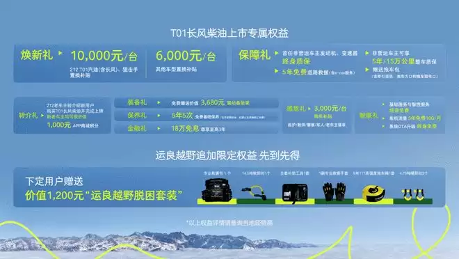 在发布会上,T01长风柴油版推出了丰厚的上市权益:包括至高3年18万免息金融政策、5年5次免费基础保养、5年免费道路救援,以及联动备胎架及拖车包免费赠送;T01汽油版及狙击手老车主可享10000元置换补贴,其它车型可享置换补贴6000元;首任非营运车主可享发动机变速箱终身质保,非营运车主可享5年/15万公里整车质保;T01老车主介绍新用户购车,双方均可获得价值千元积分;军人、教师等特定群体额外享3000元专属补贴。
