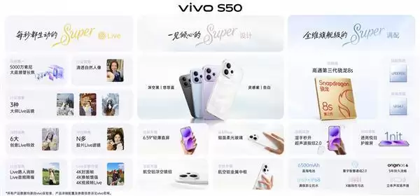 核心配置方面,vivo S50采用6.59英寸屏幕,搭载高通第三代骁龙8s处理器,前置5000万像素摄像头,后置5000万像素主摄、5000万像素潜望长焦以及800万像素超广角,电池容量为6500mAh,并支持90W闪充。