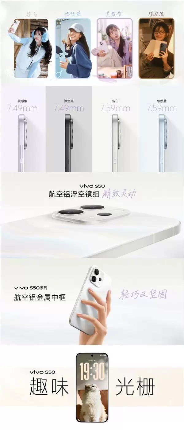 工业设计上,vivo S50采用轻薄设计,机身厚度仅7.49mm,共推出灵感紫、悠悠蓝、深空黑和告白等多款配色。