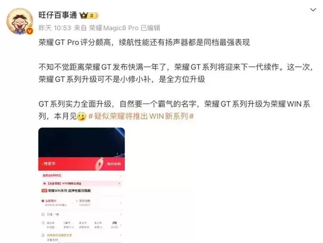 基于此,荣耀GT系列将进行全方位升级,并由GT系列命名升级为荣耀WIN系列。