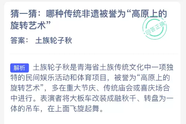 猜一猜:哪种传统非遗被誉为“高原上的旋转艺术”?【蚂蚁新村每日一题】2025年12月15日题目已发布!坚持答题,积累木兰币,即可加速小镇建设。答对本题,立即可享“产速+3/时”的加速奖励!今天正确答案是【土族轮子秋】。土族轮子秋是青海省土族传统文化中一项独特的民间娱乐活动和体育项目,被誉为“高原上的旋转艺术”。