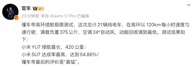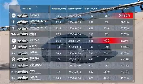 小米SU7续航首测详解:达成功率领先,YU7同组领跑