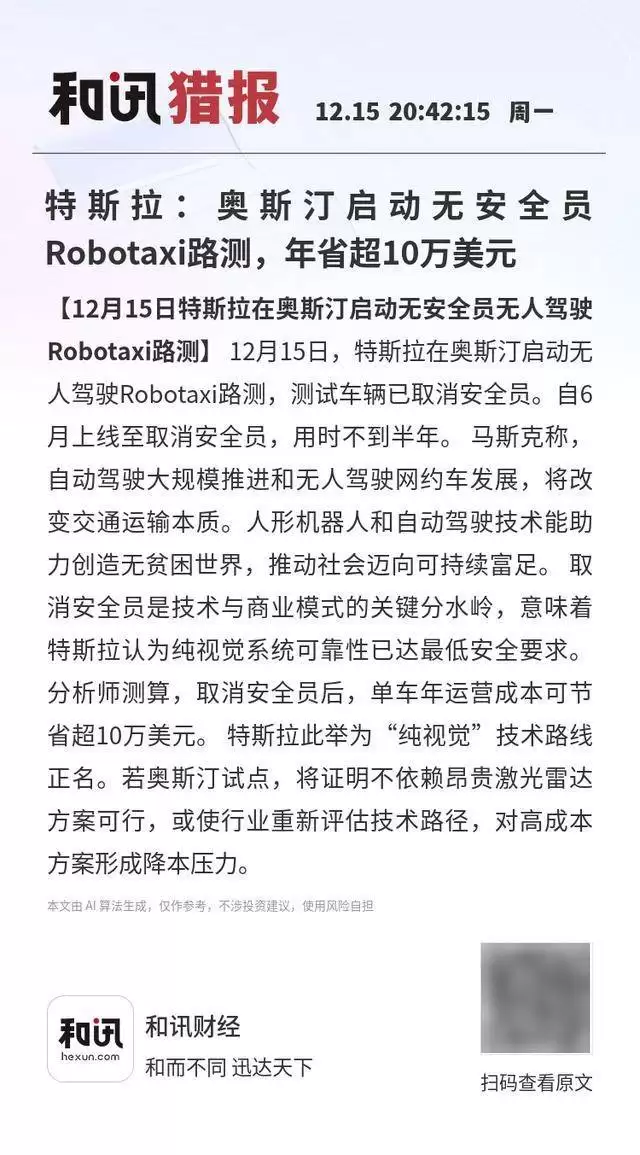 近日,特斯拉在得克萨斯州奥斯汀市迈出了自动驾驶商业化进程的关键一步——其Robotaxi(无人驾驶网约车)测试车队正式取消了车内安全员配置。这一突破性进展距离该服务6月首次上线尚不足半年,标志着特斯拉纯视觉自动驾驶方案进入规模化验证的新阶段。据行业分析师测算,此举将使单车年度运营成本削减超过10万美元,为自动驾驶技术商业化进程按下加速键。