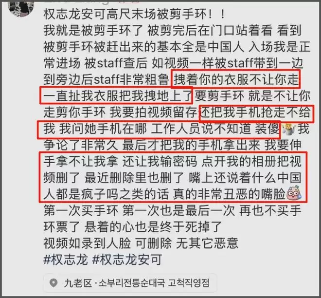 随后粉丝在权志龙演唱会上遭到工作人员暴力对待的事件也被扒出。有中粉买到手环票,疑似不符合当地实名制规定,本来禁止入场就可以,但却遭到暴力对待。不仅拽着衣服不让走,把人拽到地上也要剪断手环,还没收手机删照片,最后还要说一句“中国人都是疯子吗?”