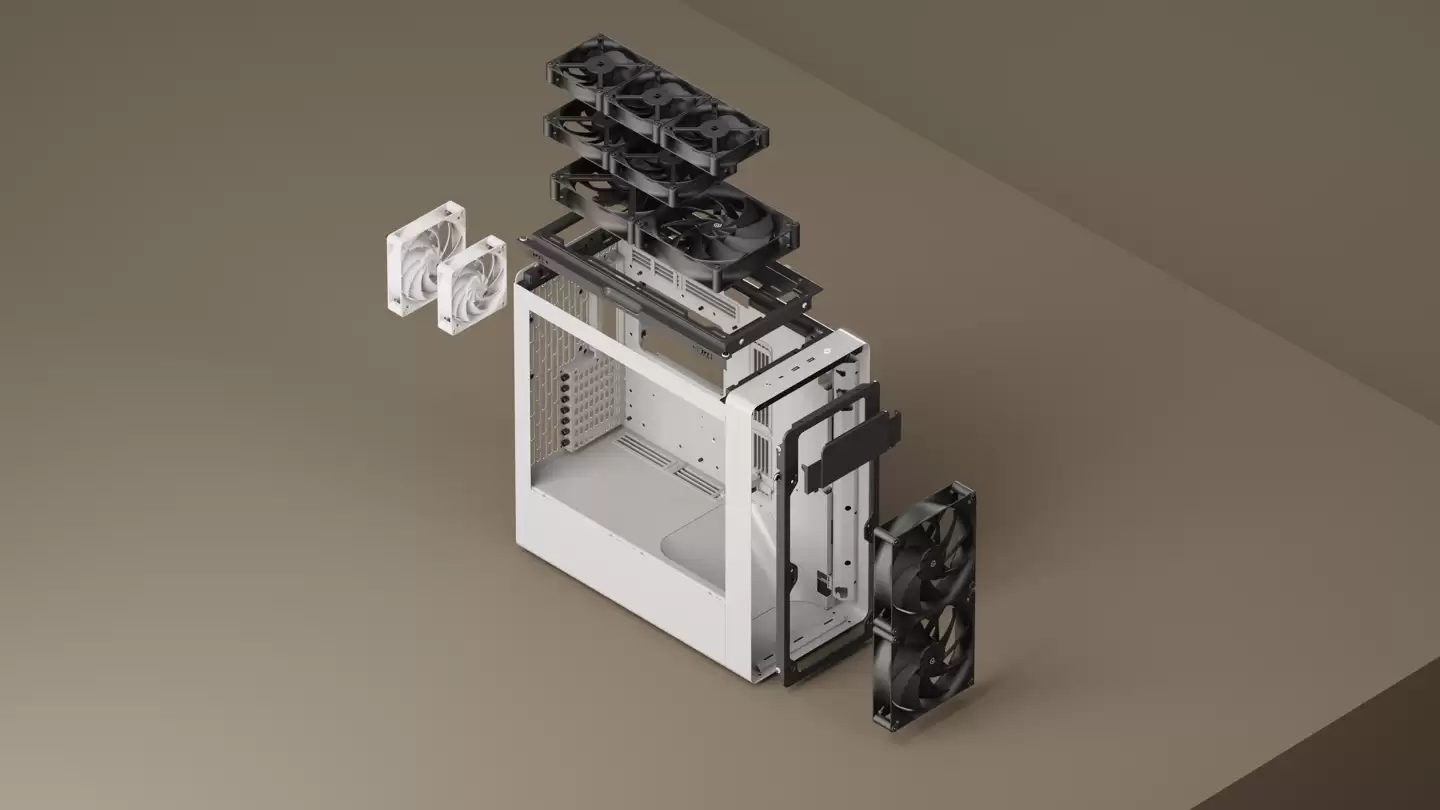 HAVN BF 360 Flow 机箱采用相对传统的上下分舱式中塔七槽布局。正面覆盖有岩石纹理宽格栅板;机箱内部侧方则设置了倾斜风道,为显卡散热提供了优化进气路径。