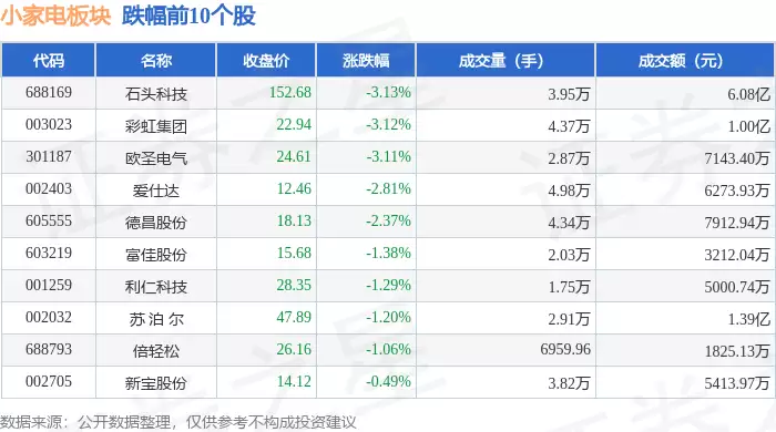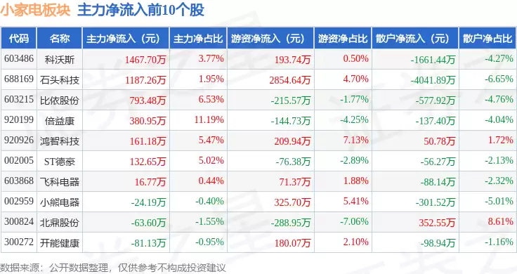 从资金动态观察,当日小家电板块主力资金净流出规模达3308.4万元,显示出机构投资者调仓意愿较强。与此形成对比的是,游资资金净流入3192.62万元,散户资金净流入115.77万元,表明中小投资者对该板块仍保持了一定的关注度。这种资金结构变化,或与板块内个股基本面的分化有关。
