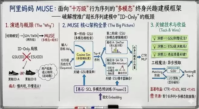 论文标题:MUSE: A Simple Yet Effective Multimodal Search-Based Framework for Lifelong User Interest Modeling论文链接:https://arxiv.org/abs/2512.07216数据集链接:https://taobao-mm.github.io/