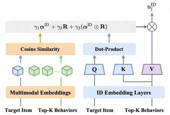 标准 DIN Target Attention:用 target ID embedding 与行为 ID embedding 做打分,得到 α_ID;同步拿到多模态相似度 R(沿用 GSU 的 r_i);将两者融合为最终打分:α_Fusion = γ₁・α_ID + γ₂・R + γ₃・(α_ID ⊙ R),其中 γ 为可学习标量,⊙ 为逐元素乘;用 Softmax (α_Fusion) 作为权重,对行为 ID embedding 做加权和,得到 u_l^ID。