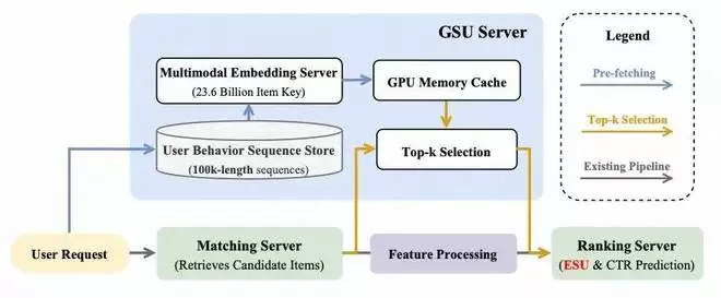Pre-fetching 阶段(与 Matching 并行)—— 用户请求到达后,Matching 负责召回候选广告,同时 GSU 服务开始从远端存储拉取用户 100K 行为的多模态 embedding,这些 embedding 预先缓存到 GPU 显存中,该步骤的时延整体被 Matching 阶段遮蔽掉;相似度计算 Top-K Selection 阶段(Ranking 前的小环节)—— 当 Matching 完成时,GSU 一侧的行为 embedding 已经就绪,此时只需对候选广告与缓存的行为 embedding 做一次相似度计算即可,得到 Top-K 行为 ID 和相似度序列,交由 Ranking 服务的 ESU 使用,这部分计算量很小,可以与 Ranking 的特征处理并行完成,对整体时延影响极小。