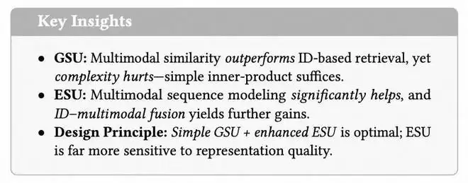 在 MUSE 之前,阿里妈妈做了大规模系统实验,对多模态在 GSU 和 ESU 两个阶段的作用做了拆分分析,得到三个关键洞察,非常适合作为工业系统设计时的参考原则。