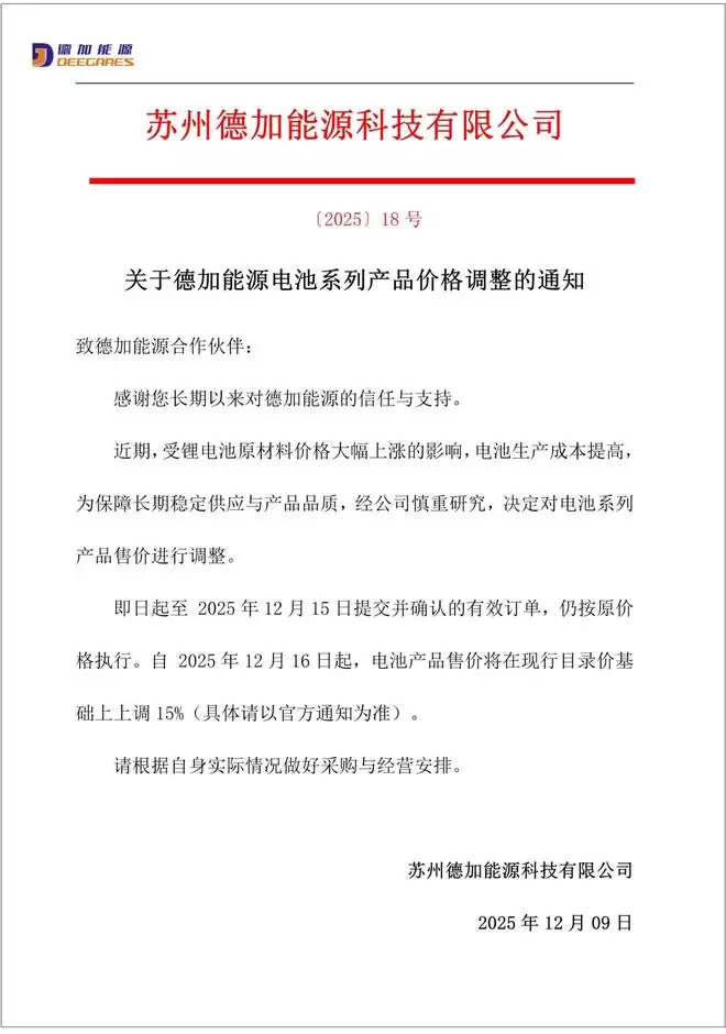 自12月16日起,德加能源旗下电池系列产品将全面上调价格,涨幅为15%。
