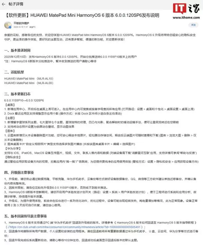 以下为华为MatePad Mini小平板HarmonyOS 6.0.0.120SP6版本升级的详细信息: 一、版本推送时间 此次更新于2025年12月15日正式发布,版本号为HarmonyOS 6.0.0.120SP6。系统将分批向已升级至6.0.0.115SP10版本的用户推送。 *注:HarmonyOS 6新版本正分批推送中,暂未收到推送的用户请耐心等待。 二、适配机型 本次升级适用于以下两款设备: • HUAWEI MatePad Mini (MLR-AL10) • HUAWEI MatePad Mini (MLR-AL00) 三、版本更新日志 本次更新从6.0.0.115SP10升级至6.0.0.120SP6,带来多项功能优化。 【桌面】 1. 新增应用中心。开启后,您可以在桌面上滑快速进入。应用中心内支持搜索或按首字母索引查找所有已安装应用。(开启路径:设置 > 桌面与个性化 > 桌面设置 > 桌面上滑) 2. Dock栏最近应用区支持调整显示的应用数量。(操作方式:长按Dock区中间的小竖白条左右滑动即可) 【主题】 1. 新增“穹宇星球”系列主题,涵盖七大星球共七个主题。星球独特的纹理、凹凸感与光影效果,配合解锁时的缓动手势,能让璀璨星辰流转于您的眼前。 2. 支持将动态照片设置为锁屏动态壁纸,呈现生动的动态视觉效果。 【图库】 1. 云图库新增“仅从本设备删除图片”功能。您可放心释放本地原片存储,轻松腾出空间。删除后,云端图片仍可随时查看和下载。(图库 > 浏览大图 > 删除 > 仅从本设备删除) 2. 图库桌面卡片的“自定义相册照片”类型,现已支持选择多张图片进行轮播展示。(长按该图库桌面卡片 > 编辑 > 选择图片) 【华为分享】 支持与iOS、iPadOS、macOS设备互传图片、视频、文件、联系人等内容和数据。(对端设备需下载“鸿蒙星河互联”应用,具体支持详情可参阅设备内的“帮助与反馈”) 【隐私安全】 新增对应用获取设备方向权限的管控,可拦截应用内“摇一摇”广告的跳转,为您提供更纯净的应用使用体验。(管控方式:设置 > 隐私和安全 > 应用获取设备方向) 四、升级前注意事项 1. 升级前,请您务必通过数据克隆、平板克隆、华为手机助手、云备份等方式做好设备数据备份。QQ、微信等第三方软件建议单独迁移备份,并确认备份内容完整有效。 2. 由于版本限制,请各位用户先将设备升级至6.0.0.115SP10版本,否则将无法收到本次版本推送。 3. 在HarmonyOS 6新版本的尝鲜期,建议您开启“用户体验改进计划”开关(路径:设置 > 系统 > 用户体验改进计划),以便工程师进行系统与应用分析、故障诊断等,持续提升版本质量。 4. 升级后,为提升使用体验,系统会在后台进行一系列优化动作。优化过程中,设备可能出现轻微发热、耗电量增加等情况,此为正常现象。设备正常使用2到3天后即可自行恢复,请您放心使用。