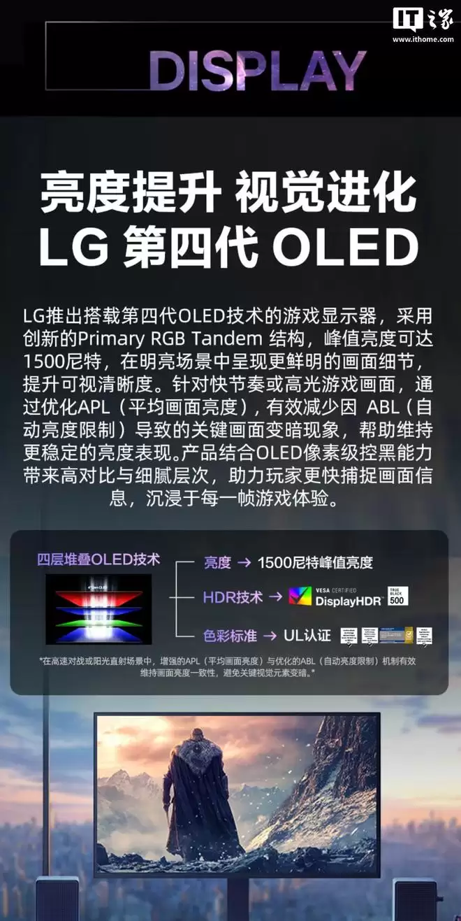 据介绍,这款显示器搭载第四代 OLED 面板,采用创新 Primary RGB Tandem 技术,峰值亮度可达 1500 尼特,可在明亮场景中呈现更多画面细节,通过 HDR500 认证,相比传统 OLED 面板功耗更低,DCI-P3 色域可达 99.5%,ΔE≤2,对比度可达 1500000:1,GTG 响应时间低至 0.02 毫秒。