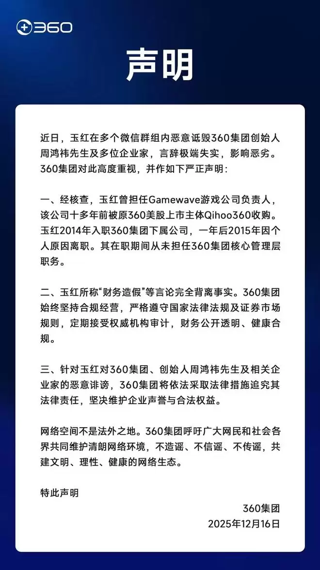 12月16日晚,360集团针对近期网络传言发布正式声明进行回应。声明指出,近期有人士在多个微信群内散播针对集团创始人周鸿祎及相关企业家的不实言论,集团对此予以高度重视。