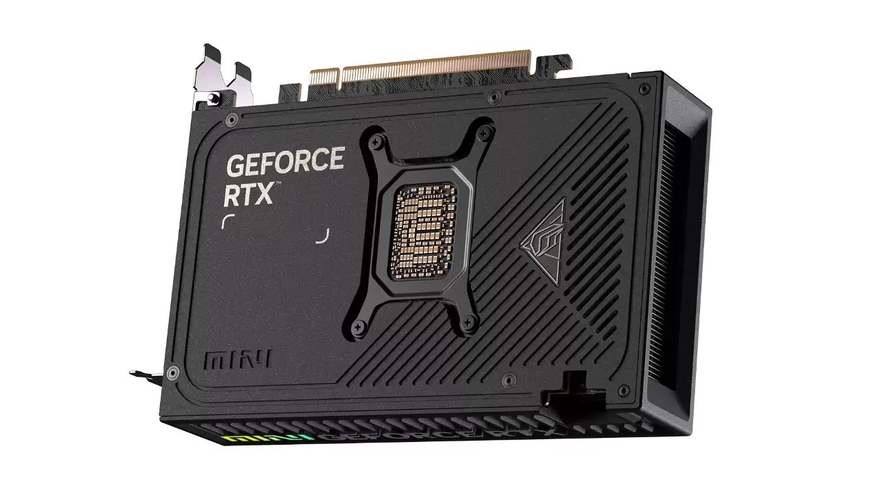 金属背板同样焕然一新,摒弃以往的深红装饰,转向纯粹工业风。雾面黑涂层不仅抗指纹,更赋予整卡低调精致的质感。背板巧妙融入iGame家族标志性的75°折角设计,利落线条勾勒出科技美感,也彰显其源自iGame的强悍性能基因。侧面新增“MINI”字样ARGB灯效,支持通过“自在星球”软件自定义光效,个性十足。