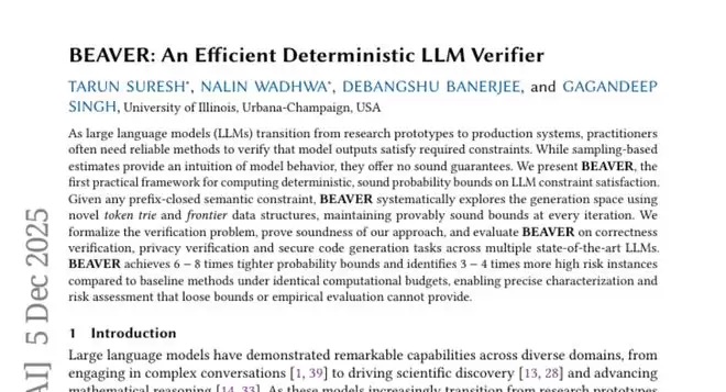 这项由伊利诺伊大学香槟分校的塔伦·苏雷什、纳林·瓦德瓦、德班舒·班纳吉和加甘迪普·辛格领导的研究发表于2025年12月的arXiv预印本论文库(论文编号:arXiv:2512.05439v1),有兴趣深入了解的读者可以通过该编号查询完整论文。这项研究在人工智能验证领域实现了重要突破,首次提供了一个名为BEAVER的框架,能够对大型语言模型的输出可靠性进行精确的数学验证。