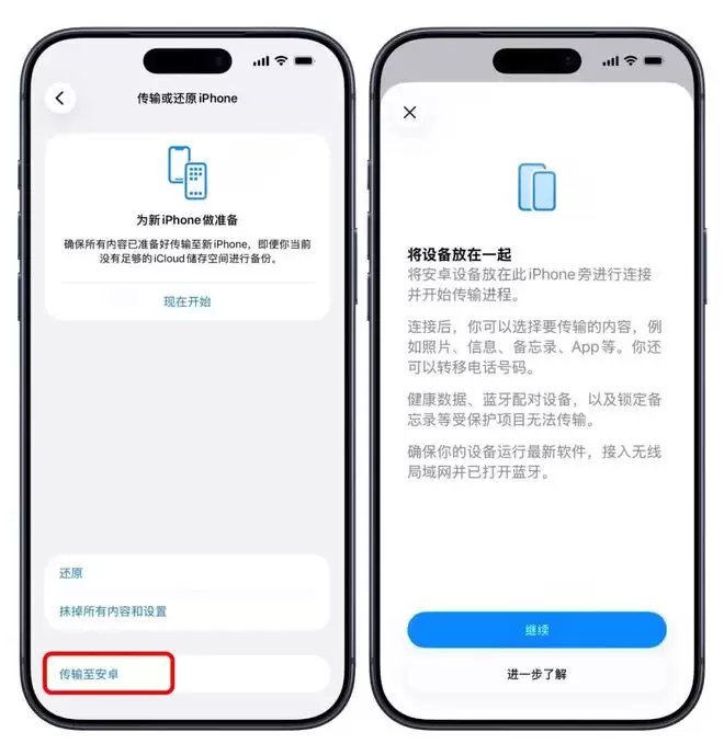 具体路径为:打开手机设置 - 通用 - 传输或还原 iPhone,在底部新增了“传输至安卓”选项。按照提示扫码,并打开WiFi和蓝牙即可开始传输。
