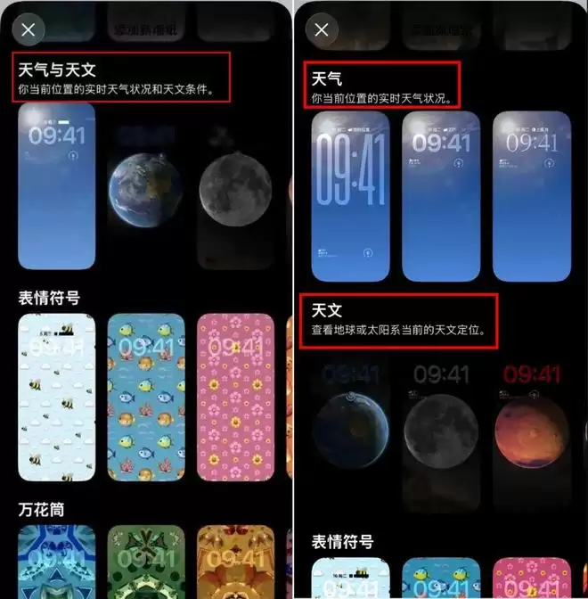 调整了锁屏壁纸的设置界面。现在天气壁纸被单独分离成一个独立板块了,而此前是与天文类壁纸一同显示的。