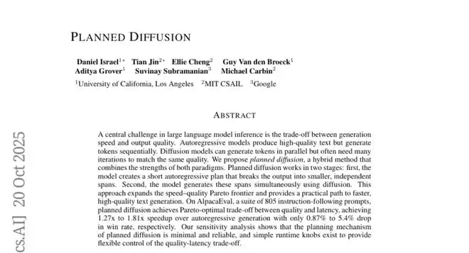 近期,一个由加州大学洛杉矶分校(UCLA)的Daniel Israel、麻省理工学院的Tian Jin和Ellie Cheng,以及谷歌的Suvinay Subramanian等研究人员组成的团队,在2025年10月发表了一项突破性研究,题为"PLANNED DIFFUSION"。这项研究首次提出了一种全新的"计划扩散"方法,有效解决了大语言模型在生成速度和质量之间的平衡难题。该研究发表在arXiv预印本平台上,论文编号为arXiv:2510.18087v1。