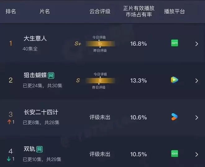 成绩尚可,市场占有率位居全平台第四名,排在第一、第二、第三的,分别是《大生意人》、《狙击蝴蝶》、《长安二十四计》。
