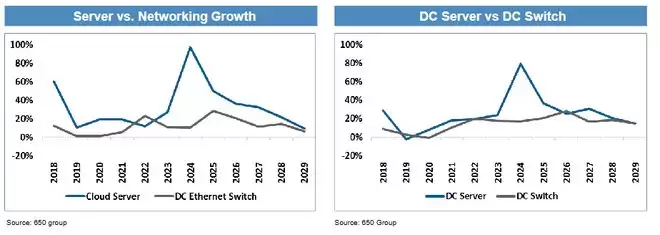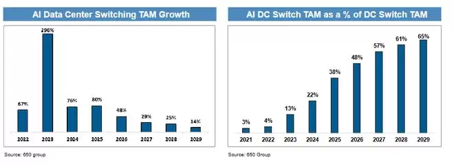 报告援引研究机构650 Group预测称,AI交换机收入将在2026年增长48%,2027年增长29%,2028年增长25%,相比之下,整体数据中心交换机行业的增长率分别为23%、19%和18%。这表明AI正成为交换机行业增长的主要驱动力。