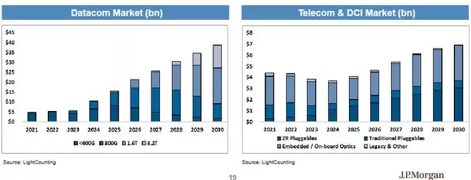 在光学互连领域,数据通信市场预计2026年将增长40%至200亿美元,并在2030年前保持20%的复合年增长率。电信和数据中心互连市场也将在2026年增长约15%至50亿美元。
