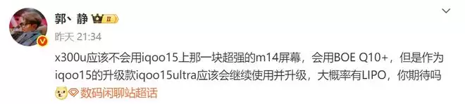 据博主透露的信息,iQOO 15 Ultra采用6.85英寸的三星2K LTPO直屏,通过LIPO极窄封装工艺将四边黑框收细到极致。